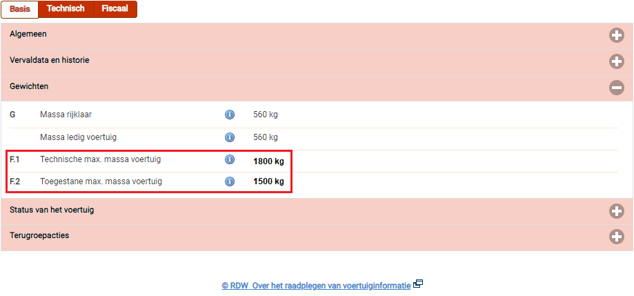 Eerst moet vastgesteld worden hoe zwaar de auto en trailer zijn ‘op papier’. Bij de auto staat het volgende op het kentekenbewijs: