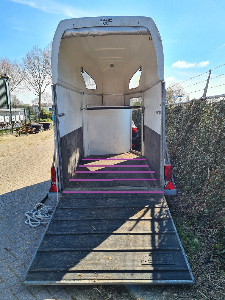 - Loop samen met jouw paard de trailer in en beloon je paard met wat lekkers als hij bij de borststang komt.