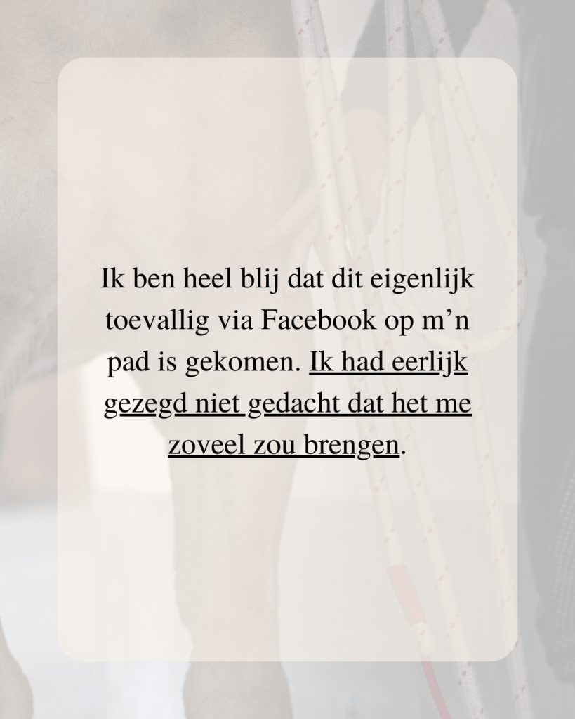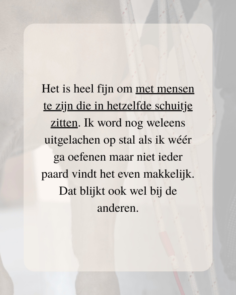 En het mooiste: je doet dit niet alleen. In de groep ontmoet je andere paardeneigenaren die tegen precies dezelfde dingen aanlopen. Je leert van elkaar, steunt elkaar én deelt successen.