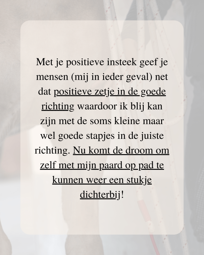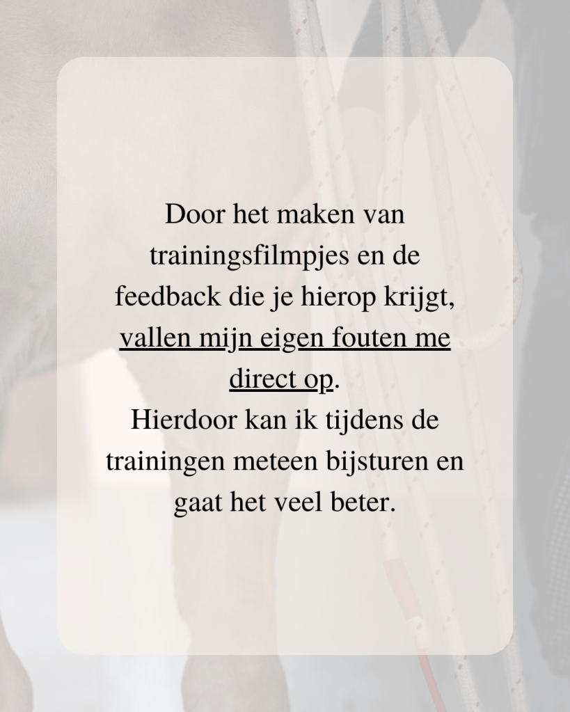 Daarnaast oefenen we in kleine, haalbare stappen. Zo kun je rustig opbouwen en weet je zeker dat je geen fouten maakt die het lastiger maken voor je paard.