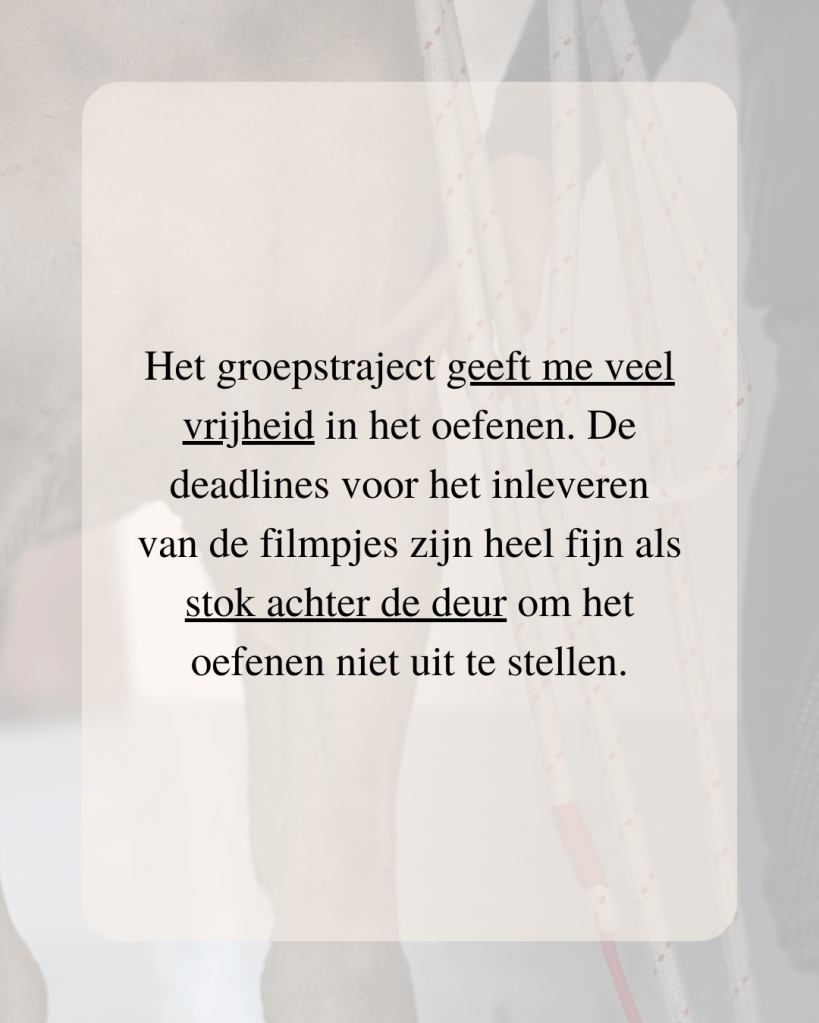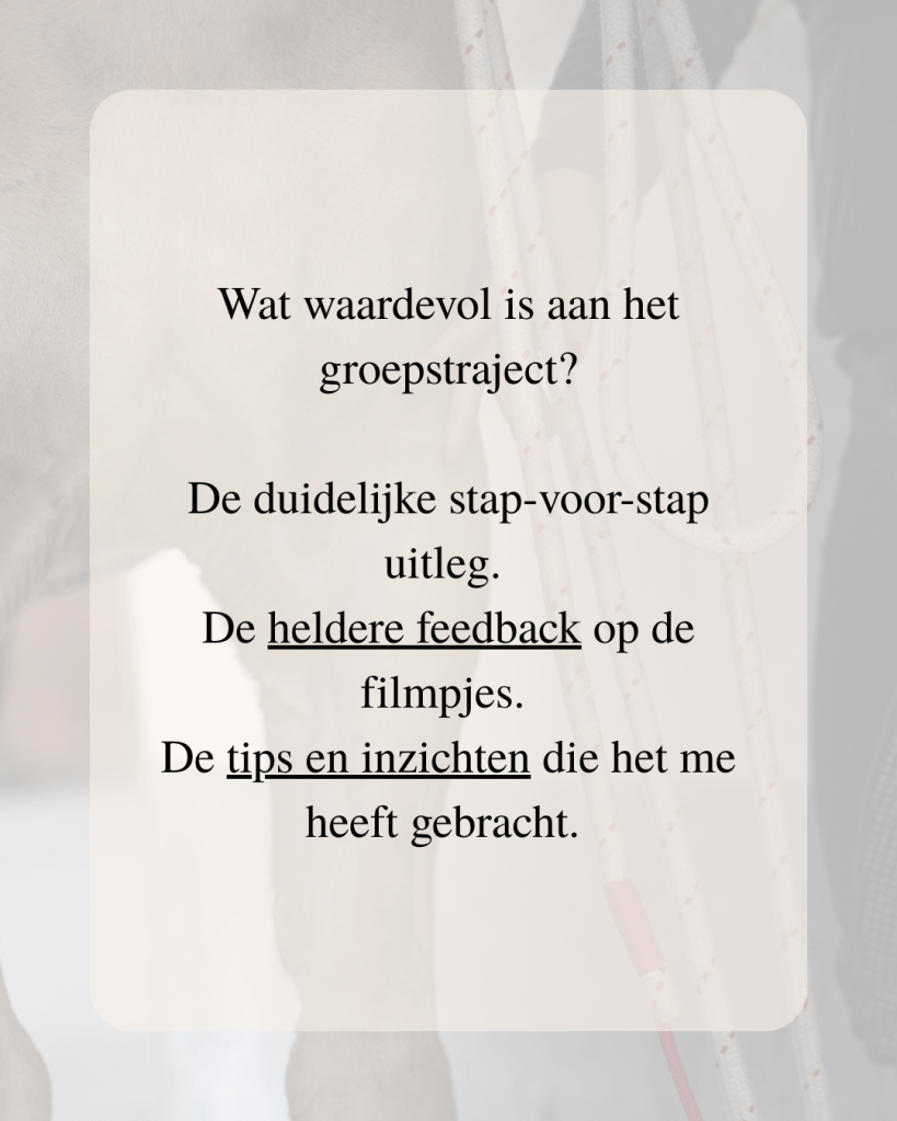 In dit traject werk je met een heldere structuur die stap voor stap is opgebouwd. Je krijgt inzicht in het waarom achter het gedrag van je paard én praktische oefeningen die je direct kunt toepassen. Daarbij kijk ik met je mee en krijg je persoonlijke feedback, zodat je zeker weet dat je het goed doet. Juist doordat jij het zelf leert en begrijpt, bouw je een stevige basis waar je altijd op terug kunt vallen. Dat maakt het verschil.