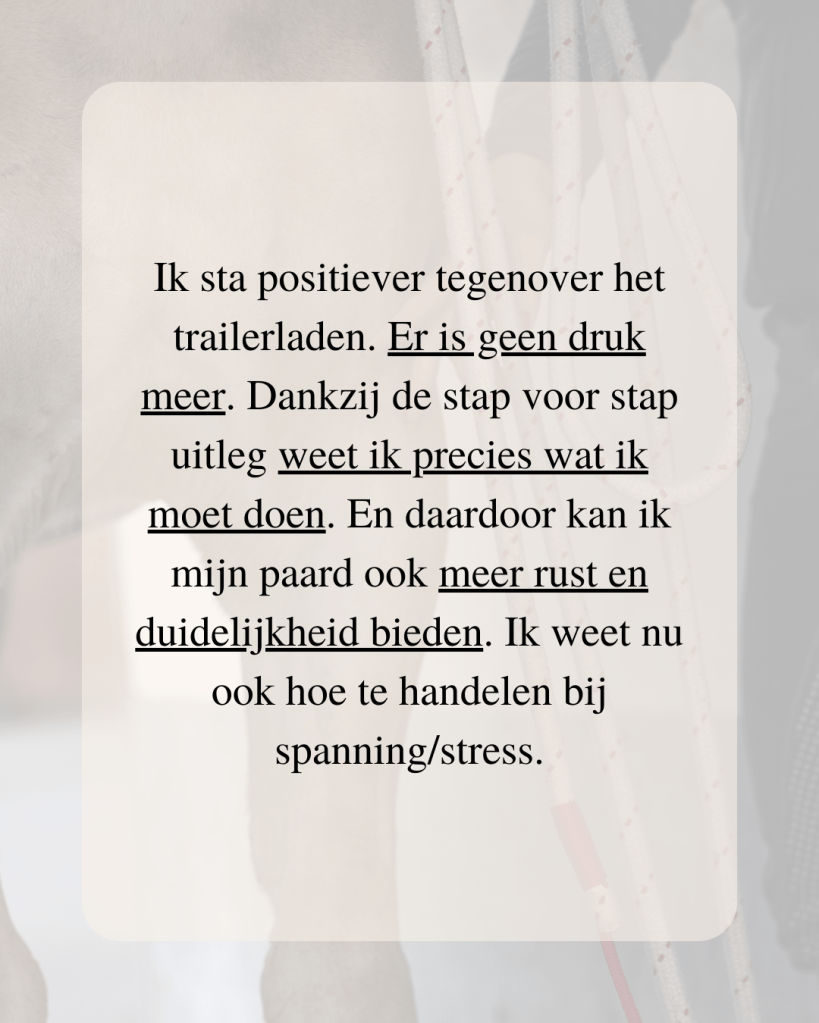 ✔ Jouw paard loopt, elke keer opnieuw, rustig en zelfverzekerd de trailer in. Er is geen strijd en stress meer bij het laden.